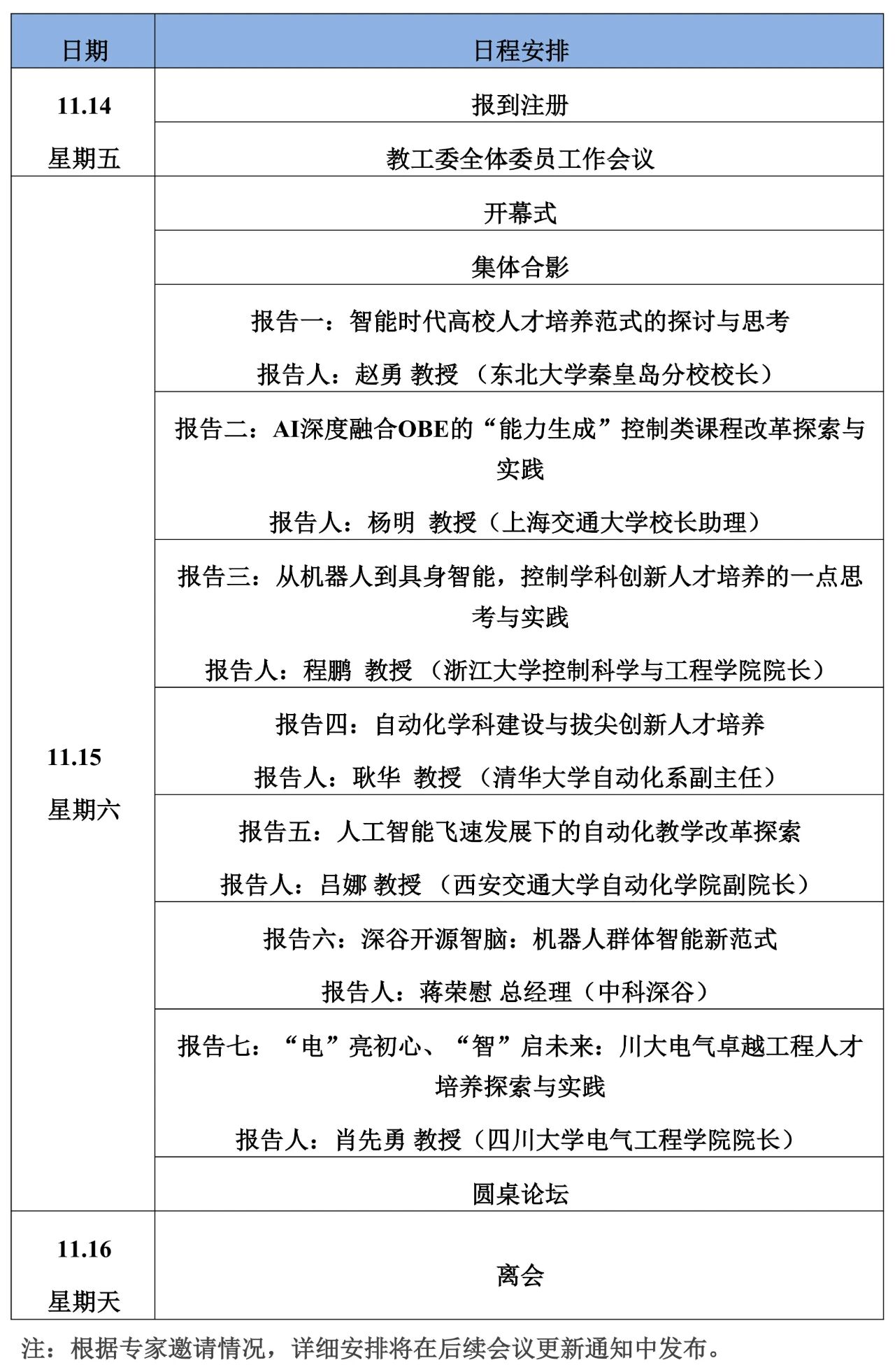 14日报到,14日为教工委工作会议,15日全天大会会议,16日可离会。