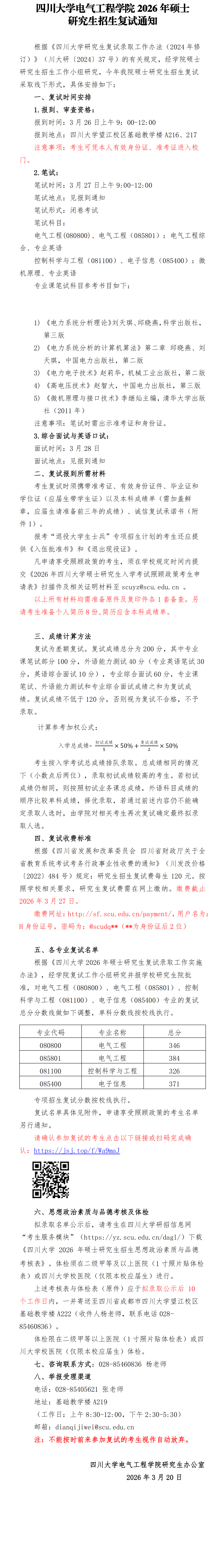 四川大学电气工程学院2026年硕士研究生招生复试通知-凯发网址